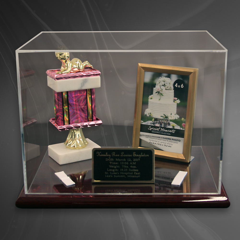 Newborn Baby Acrylic Display Case, with a Piano finished base and engraved plates. This Award includes a 4″ x 6″ Frame, name plate, and a marble trophy award.