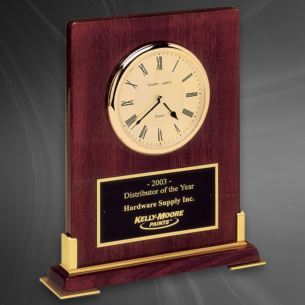 Desktop clock rosewood piano-finish wood with gold metal accents. Comes with custom Plate colors and Fonts!